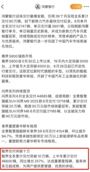 同篇博文中,鸿蒙系列在售品牌问界、享界、尊界均有近期详细数据披露,官方唯独没有单独公开智界当月销量表现。根据奇瑞发布的数据,智界品牌6月销售仅2459辆,不及问界品牌的零头。