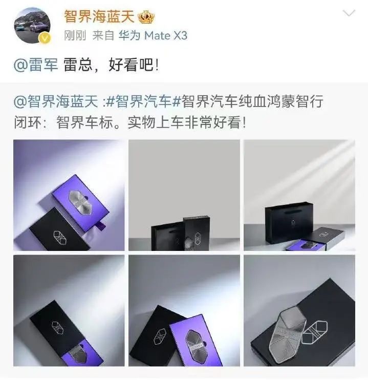 日前,网友发现智界产品总监海蓝天转发智界的车标相关内容,并@雷军,表示“雷总,好看吧!”