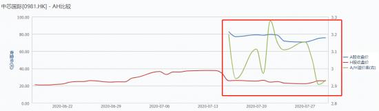 我们可以看到,从宣布回A上市之后,中芯国际的H股价格就一路走高,登陆A股后估值更是高得吓人,截止7月29日,中芯国际(0981.HK)以港股价格计算的话,总市值2097亿港元,而A股(688981.SH)计价市值则达到5629亿元人民币,AH折溢价率达到了193%。