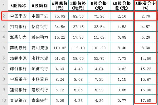 再看大盘股,溢价率最低的是中国平安,仅仅只有2.79%,说明港股和A股的价差极小,在近期的波动中甚至一度A股相对于港股还要折价。