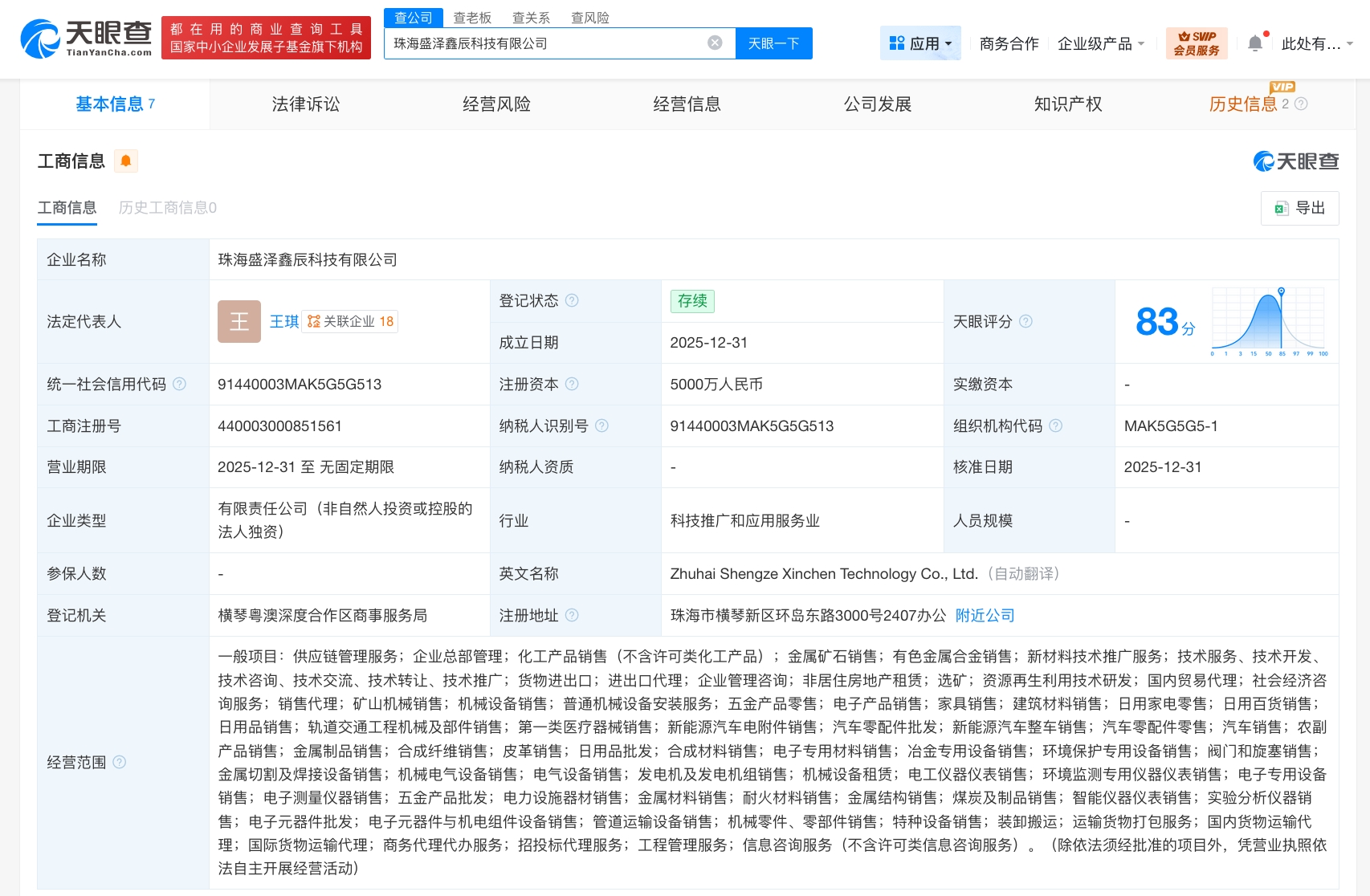 天眼查App显示,近日,珠海盛泽鑫辰科技有限公司成立,法定代表人为王琪,注册资本5000万人民币,经营范围含供应链管理服务、企业总部管理、化工产品销售、金属矿石销售、有色金属合金销售、企业管理咨询等。