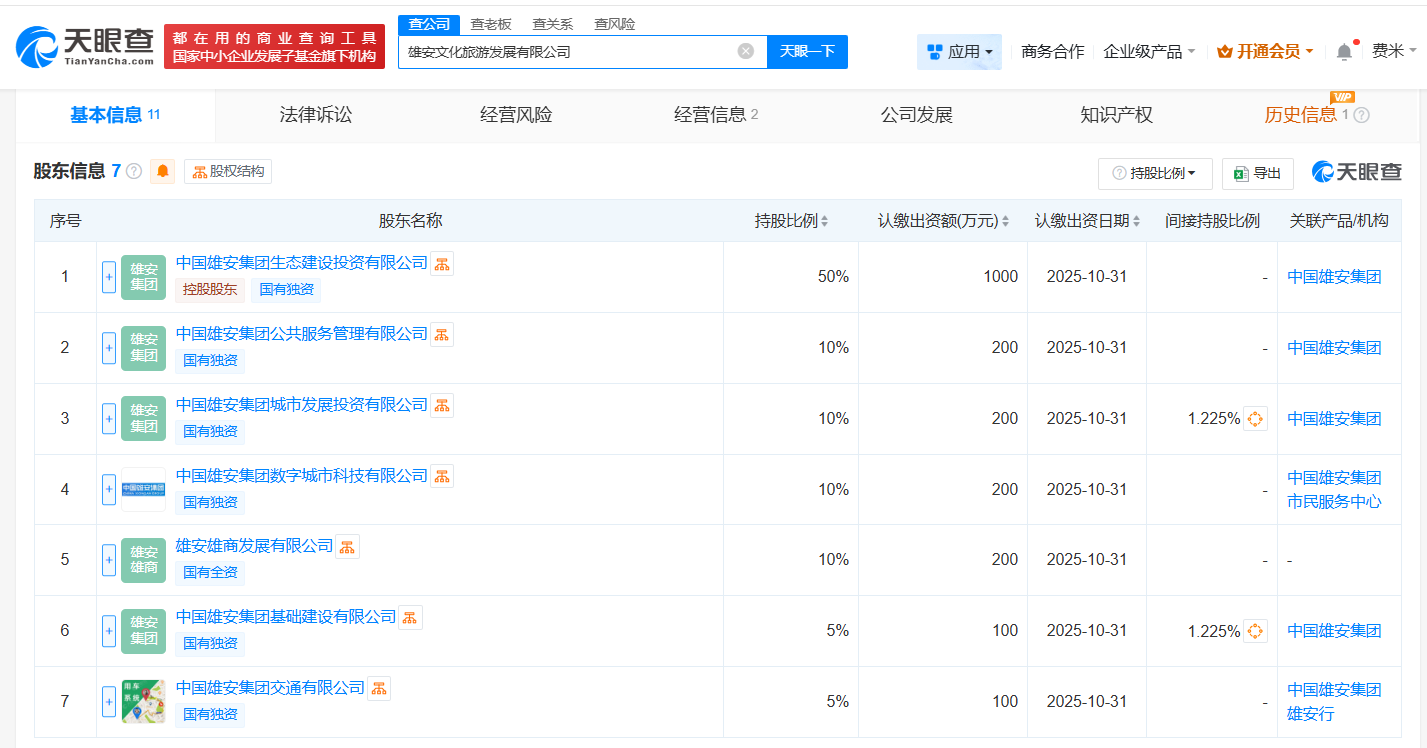 天眼查App显示,近日,雄安文化旅游发展有限公司成立,法定代表人为侯润,注册资本2000万人民币,经营范围包括旅游业务、第二类增值电信业务、互联网信息服务、城市公共交通、道路旅客运输站经营、巡游出租汽车经营服务等。股东信息显示,该公司由中国雄安集团生态建设投资有限公司、中国雄安集团公共服务管理有限公司、中国雄安集团城市发展投资有限公司等共同持股。