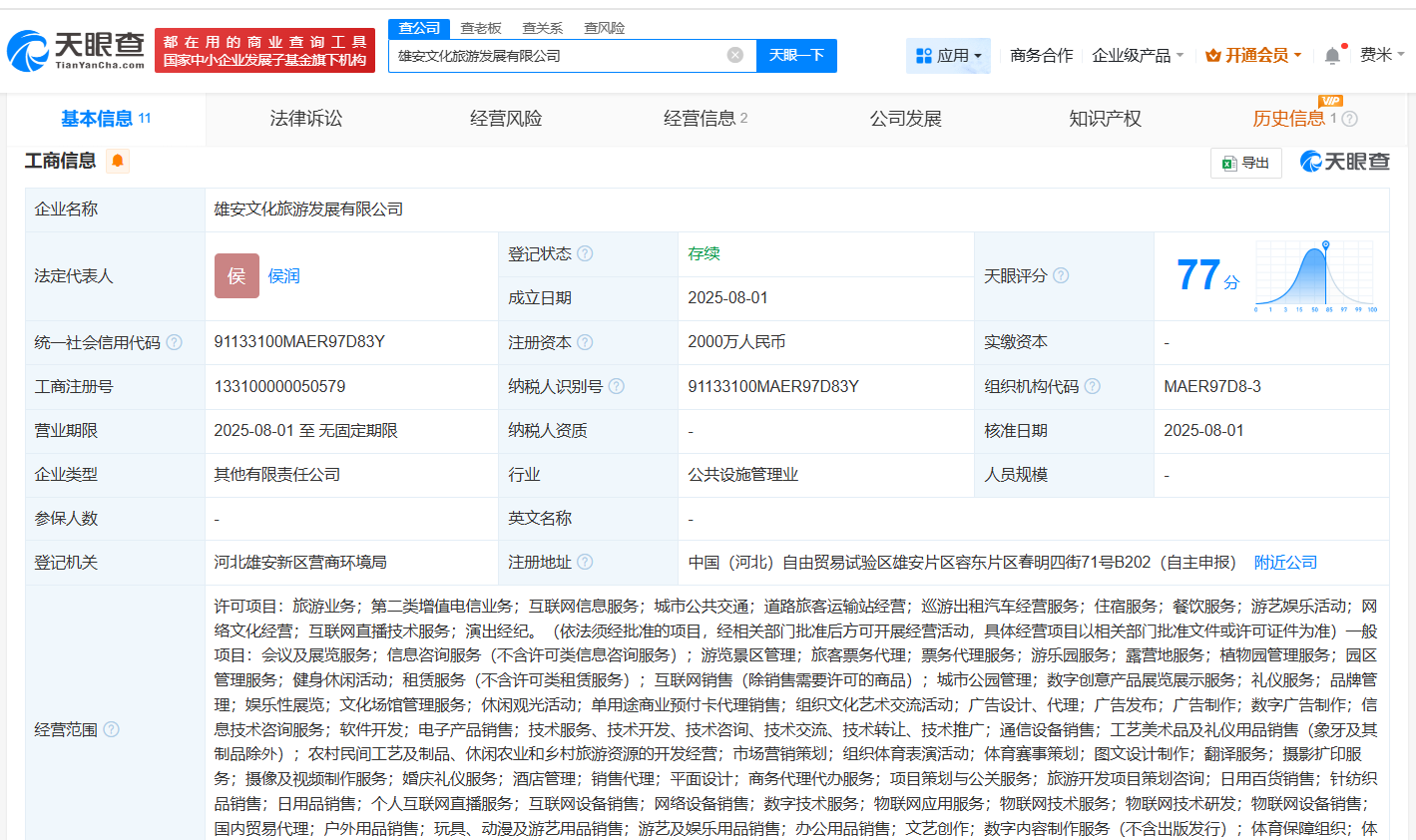 天眼查App显示,近日,雄安文化旅游发展有限公司成立,法定代表人为侯润,注册资本2000万人民币,经营范围包括旅游业务、第二类增值电信业务、互联网信息服务、城市公共交通、道路旅客运输站经营、巡游出租汽车经营服务等。