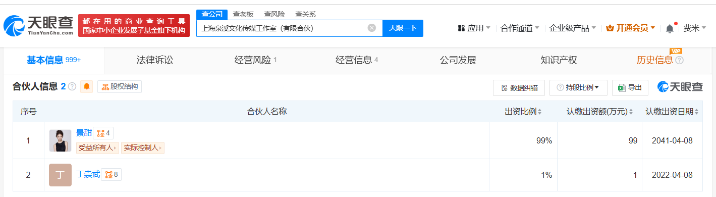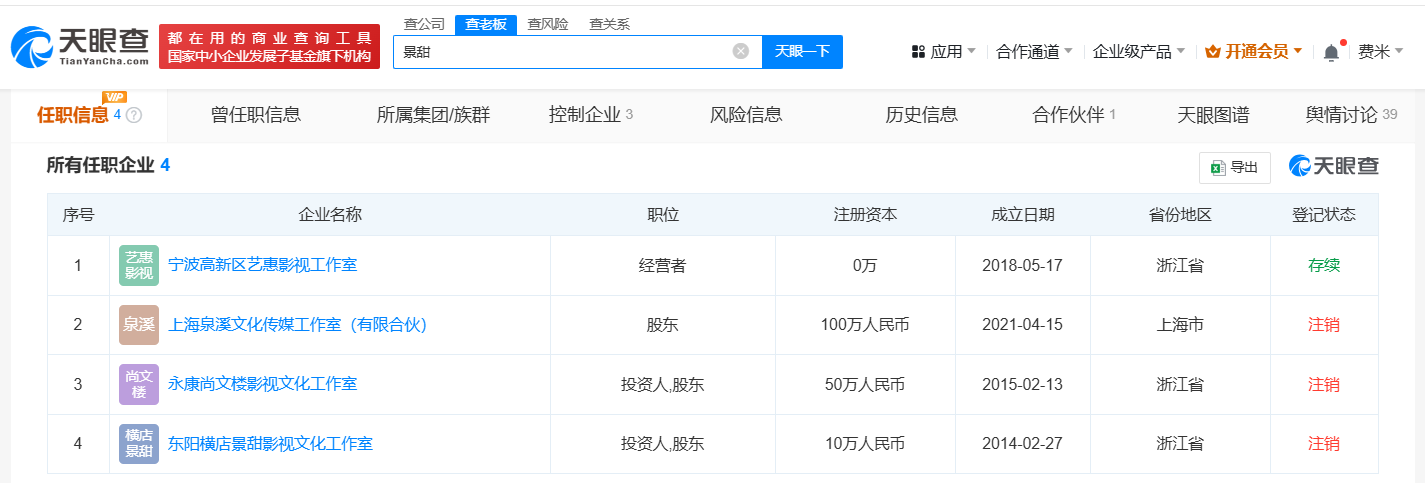 上海泉溪文化传媒工作室(有限合伙)成立于2021年4月,执行事务合伙人为丁崇武,出资额100万人民币,经营范围包括组织文化艺术交流活动、电影摄制服务、其他文化艺术经纪代理、文艺创作、市场营销策划、信息咨询服务等,由景甜、丁崇武分别出资99%、1%。值得一提的是,目前景甜名下仅宁波高新区艺惠影视工作室处于存续状态,其余3家工作室均已注销。