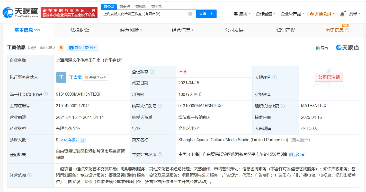 天眼查App显示,近日,上海泉溪文化传媒工作室(有限合伙)登记状态由存续变更为注销。今年3月,该工作室已发布简易注销公告。