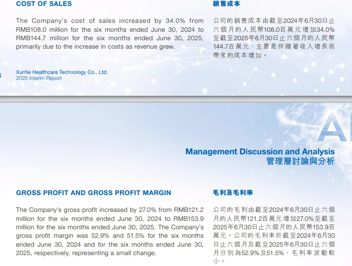 尽管如此,销售成本的上涨速度,可能会成为讯飞医疗提高利润的一大阻碍。半年报显示,讯飞医疗2025年上半年销售成本为1.45亿元,相比上年同期的1.08亿元增加了34%,比营收30.3%的增幅要高出3.7%,这也导致讯飞医疗的毛利从上年同期的52.9%降至2025年上半年的51.5%。