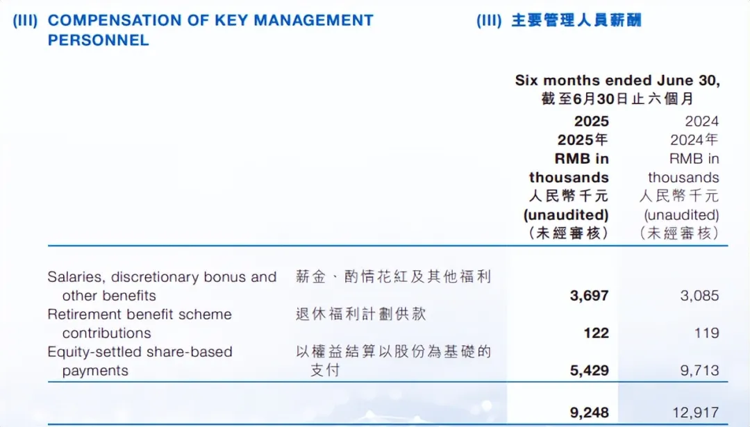 当然,可能是由于依旧处于亏损期,主要管理人员以权益结算以股份为基础的支付从上年同期的971.3万元,下降至2025年上半年的542.9万元。