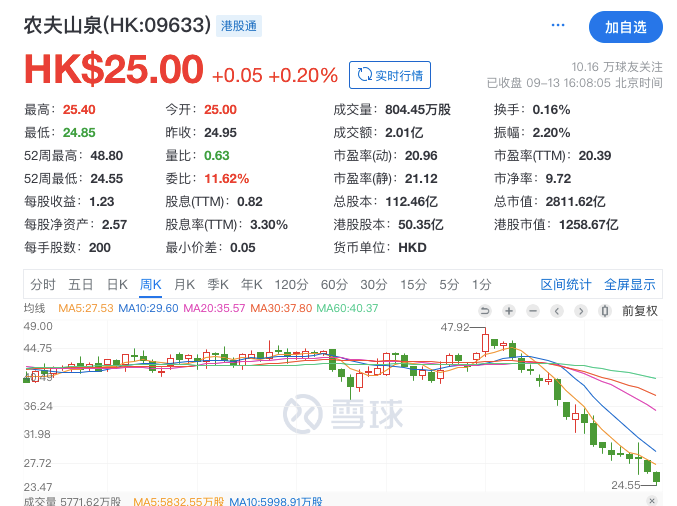 而港股的农夫山泉,也堪称多灾多难,每股从五月份的高点47.92港元,跌至25港元,典型的腰斩。