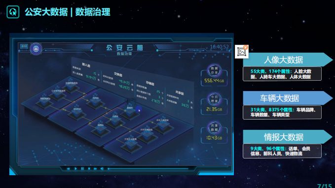在数据采集端,“公安云脑”通过接入视频、图像、物联网等前端采集数据,融合政府、公安等业务系统数据,汇聚酒店住宿、网吧、出行、物流等社会数据,通过公安行业深度定制的数据治理能力,从海量数据提取出有业务价值的信息,由此构成以人像大数据、车辆大数据、情报大数据为核心的数据中台。