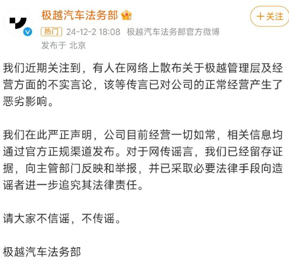 在负面消息愈演愈烈之时,极越汽车法务部开始下场辟谣,极越方面要表示:我们在此严正声明,公司目前经营一切如常,相关消息均通过官方正规渠道发布。对于网传谣言,我们已经留存证据向主管部门反映和举报,并已采取必要法律手段向造谣者进一步追究其法律责任。请大家不信谣,不传谣。