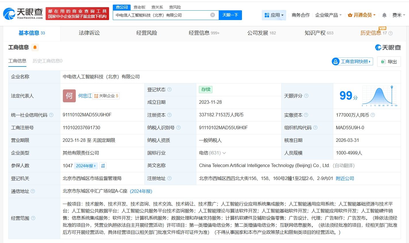 该公司成立于2023年11月,法定代表人为何忠江,经营范围含人工智能行业应用系统集成服务、人工智能基础资源与技术平台、人工智能理论与算法软件开发等,现由中国电信(601728)及上述新增股东共同持股。