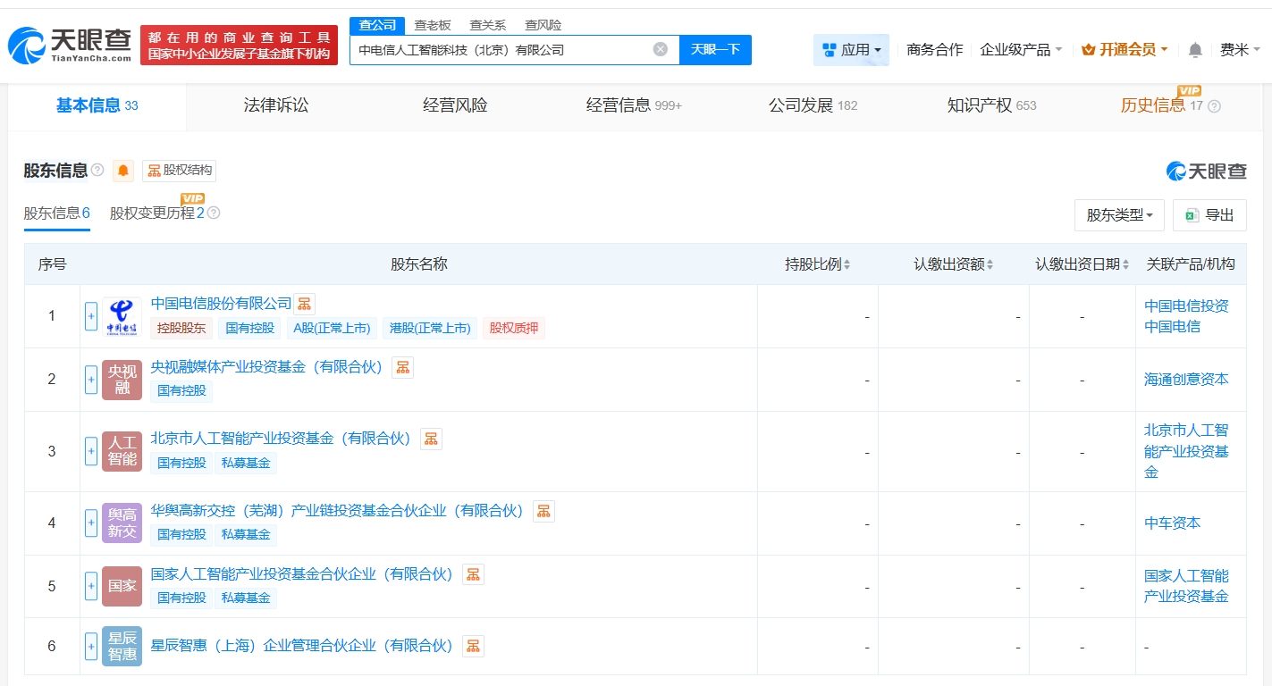 天眼查App显示,近日,中电信人工智能科技(北京)有限公司发生工商变更,新增北京市人工智能产业投资基金(有限合伙)、国家人工智能产业投资基金合伙企业(有限合伙)等为股东,同时,注册资本由30亿人民币增至约33.7亿人民币,增幅约12%。
