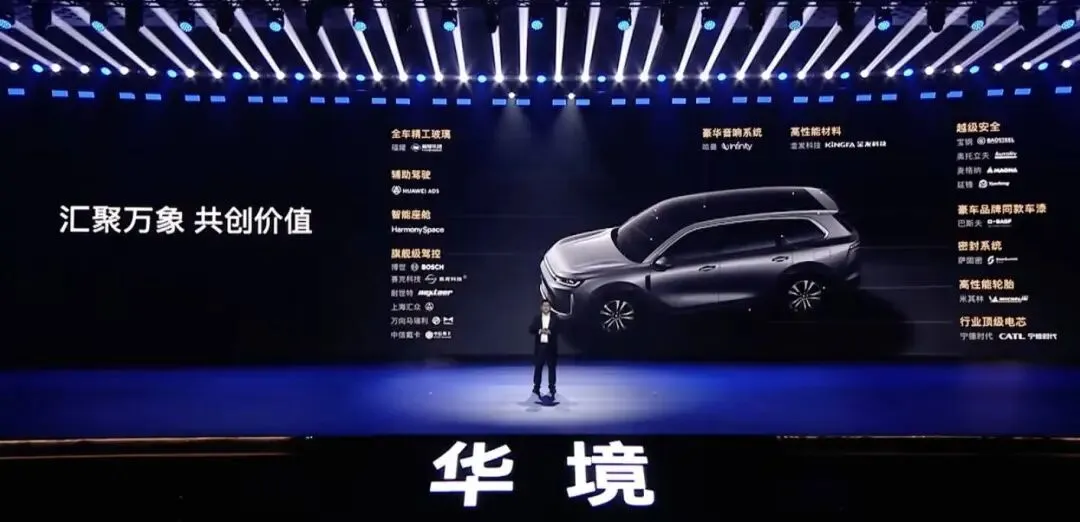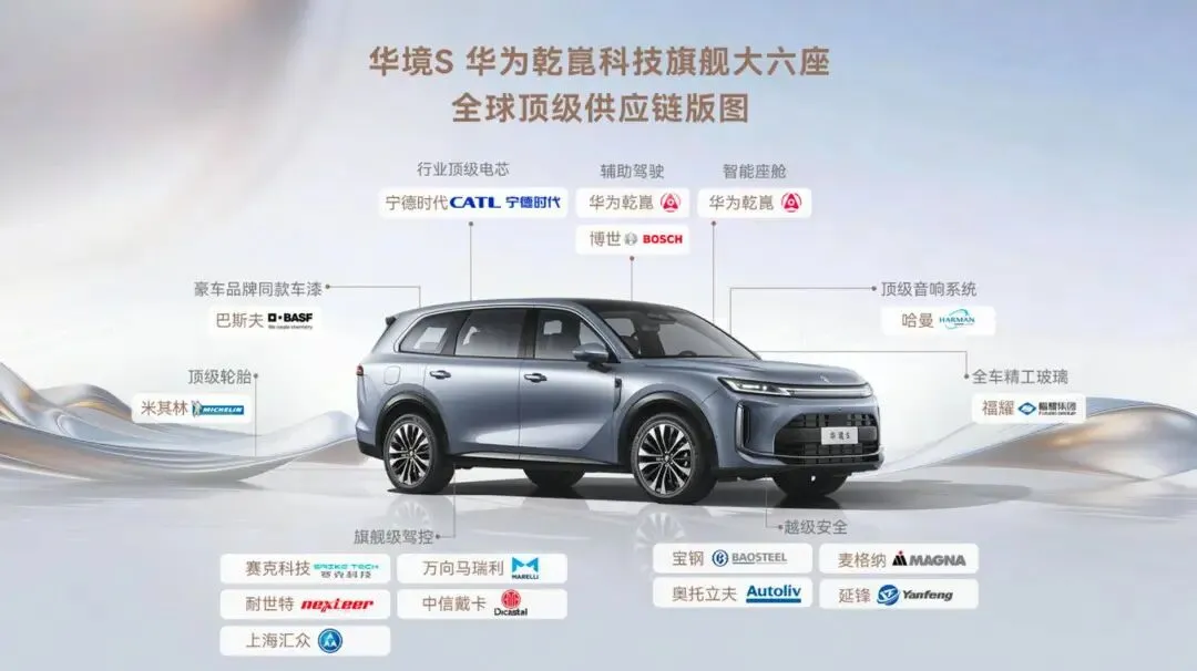 翻开华境S的供应商与零部件,宁德时代的增混电芯、宝钢的一体化热成型钢、福耀专门定制的光学玻璃、来自巴斯夫的豪车品牌同款车漆、哈曼顶级音响系统、华为乾崑智驾、鸿蒙座舱等,堪称“全身名牌”,基本上将以内能够获得顶尖软硬件都用上了。