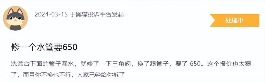 还有一位网友投诉称,洗漱台下面的管子漏水,啄木鸟的师傅就修了一下三角阀,换了跟管子,要了650元。“这个报价也太狠了,而且你不换也不行,人家已经给你拆了。”
