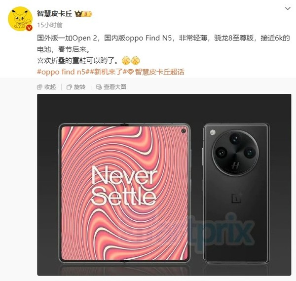 OPPO Find N5或春节后发布:搭载骁龙8至尊版 机身非常轻薄快讯