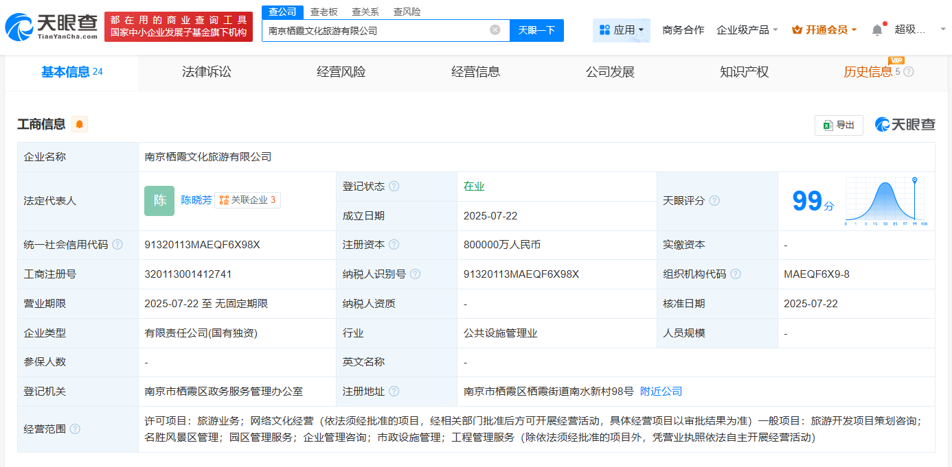 天眼查App显示,近日,南京栖霞文化旅游有限公司成立,法定代表人为陈晓芳,注册资本80亿人民币,经营范围包括旅游开发项目策划咨询、名胜风景区管理、园区管理服务、企业管理咨询等。