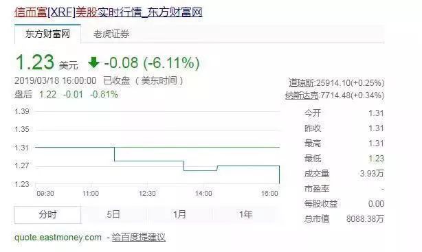 截至2019年3月18日,信而富每股股价为1.23美元,距2017年10月历史最高价格12.86美元,已经跌去九成...