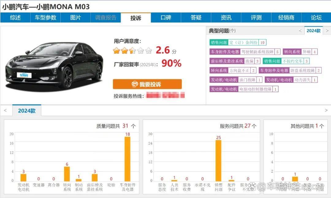 从车质网的信息来看,小鹏MONA M03存在多起销售方面的投诉,内容涉及出售问题车、定(订)金纠纷、不按约交车等等;而在车辆质量问题方面,小鹏MONA M03出现了驾驶辅助系统故障、转向系统异响、悬挂系统跑偏、防盗系统故障、油门故障、动力消失、电驱动控制器故障等投诉,虽然数量不多,但存在较大的安全隐患,引发了其他消费者的担忧。