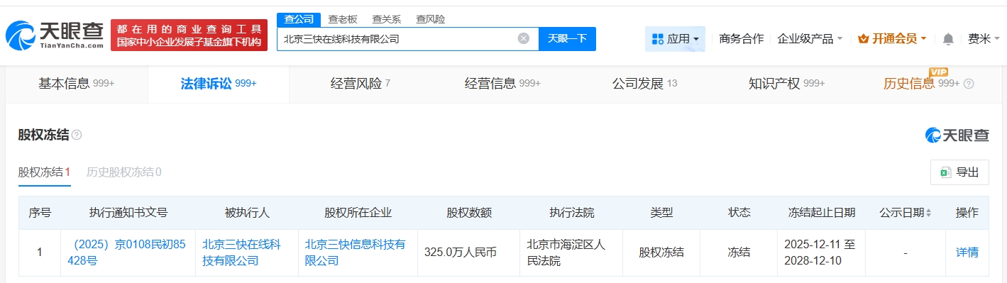 天眼查天眼风险信息显示,近日,北京三快在线科技有限公司新增一则股权冻结信息,股权所在企业为北京三快信息科技有限公司,冻结股权数额325万人民币,冻结期限为3年,执行法院为北京市海淀区人民法院。