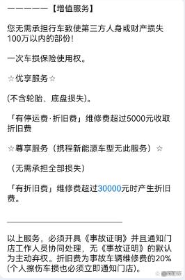 且客户如果每天多加80元或150元,分别可享受携程租车“优享服务”与“尊享服务”。所谓“优享服务”即不含轮胎、底盘损失,且有停运费、折旧费。维修费超过5000元收取折旧费。