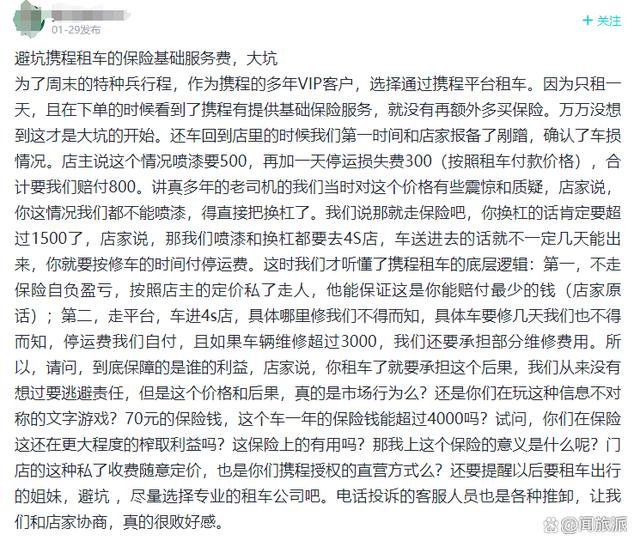 这就是车行与携程租车的第一层利益链条,携程租车打着车辆保障服务费名义,收取额外一笔利润。车行利用各种小刮蹭的痕迹,对客户“有枣没枣都打一杆”看看,拿到钱也是额外利润。