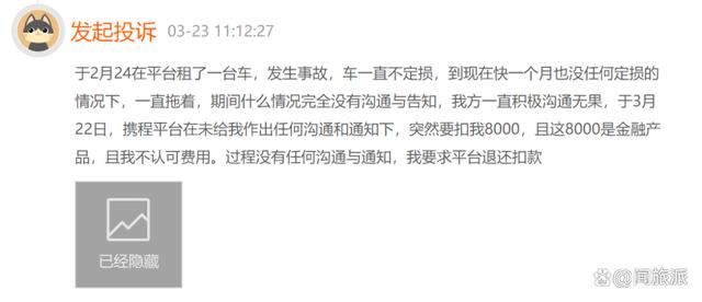 有消费者投诉称,通过携程租车发生事故后,接近一个月没有定损通知。突然某一天,携程在未有任何通知情况下,直接从绑定银行卡上划走8000元。