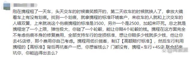 有网友吐槽,携程租车定损标准的上限极高,弹性非常大。平台也几乎不考虑伤痕本身的修复费用,只会支持车行的定损价。且送4S店后需要按天支付停运费。且携程租车不管折旧费,即3000元以上的车损,客户要承担30%。