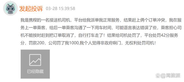 另一位司机接到携程派单时正在跑另一单,乘客取消订单,结果被平台扣除42分,平台加公司共罚款1200元。