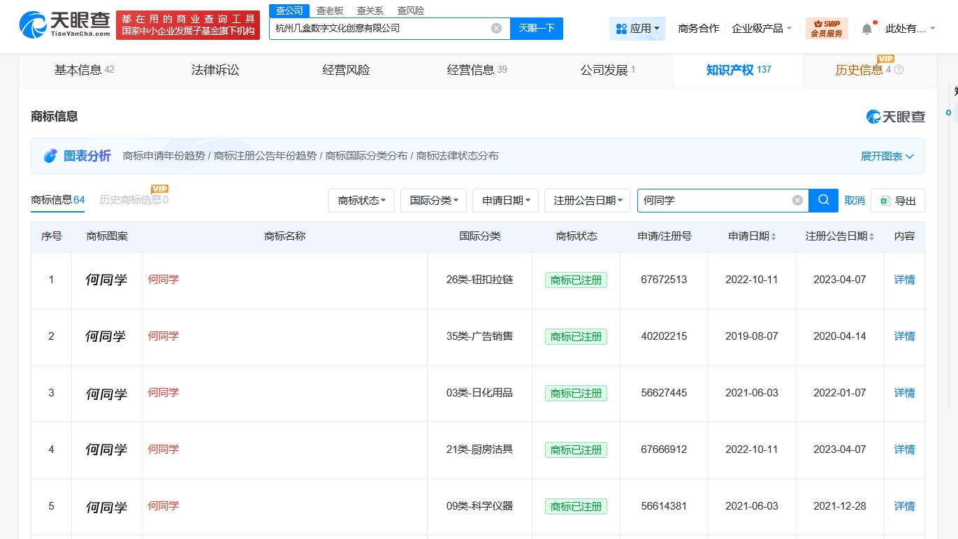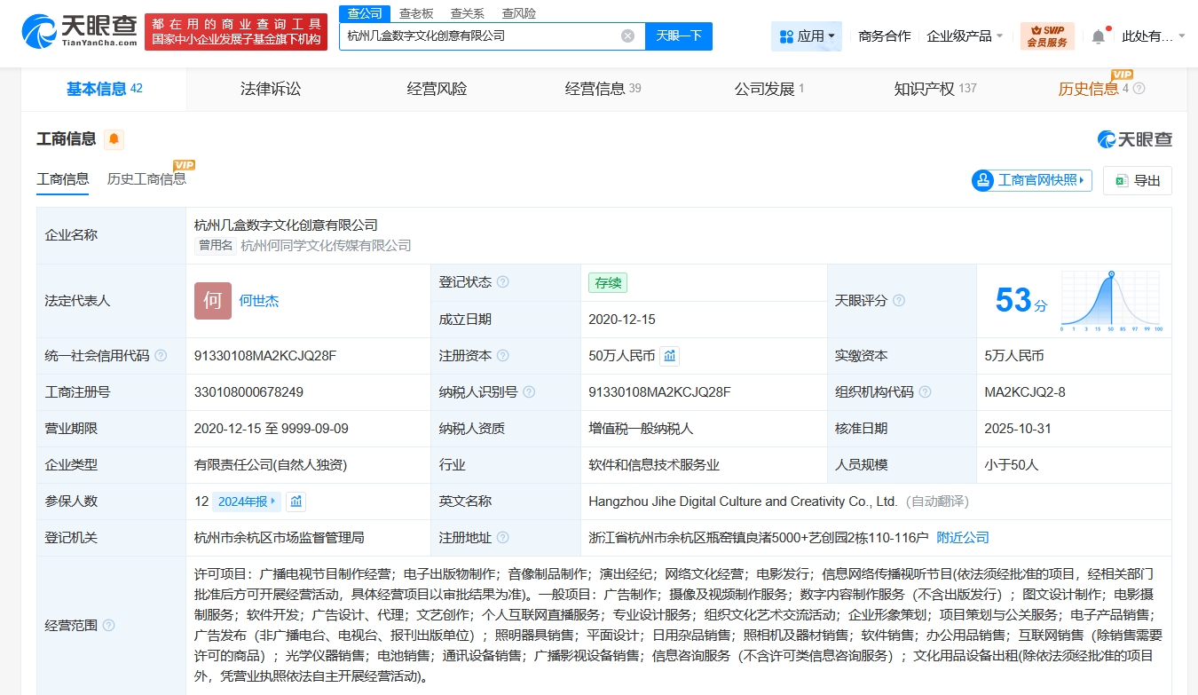 天眼查任职信息显示,何同学(何世杰)名下关联1家杭州几盒数字文化创意有限公司。该公司成立于2020年12月,法定代表人为何世杰,注册资本50万人民币,经营范围含广播电视节目制作经营、电子出版物制作、音像制品制作、演出经纪、网络文化经营、电影发行、信息网络传播视听节目、摄像及视频制作服务、数字内容制作服务等。股东信息显示,该公司由何世杰全资持股。变更记录显示,2023年10月,该公司注册资本由5万人民币增至50万人民币。知识产权信息显示,该公司已成功注册多枚“何同学”商标。