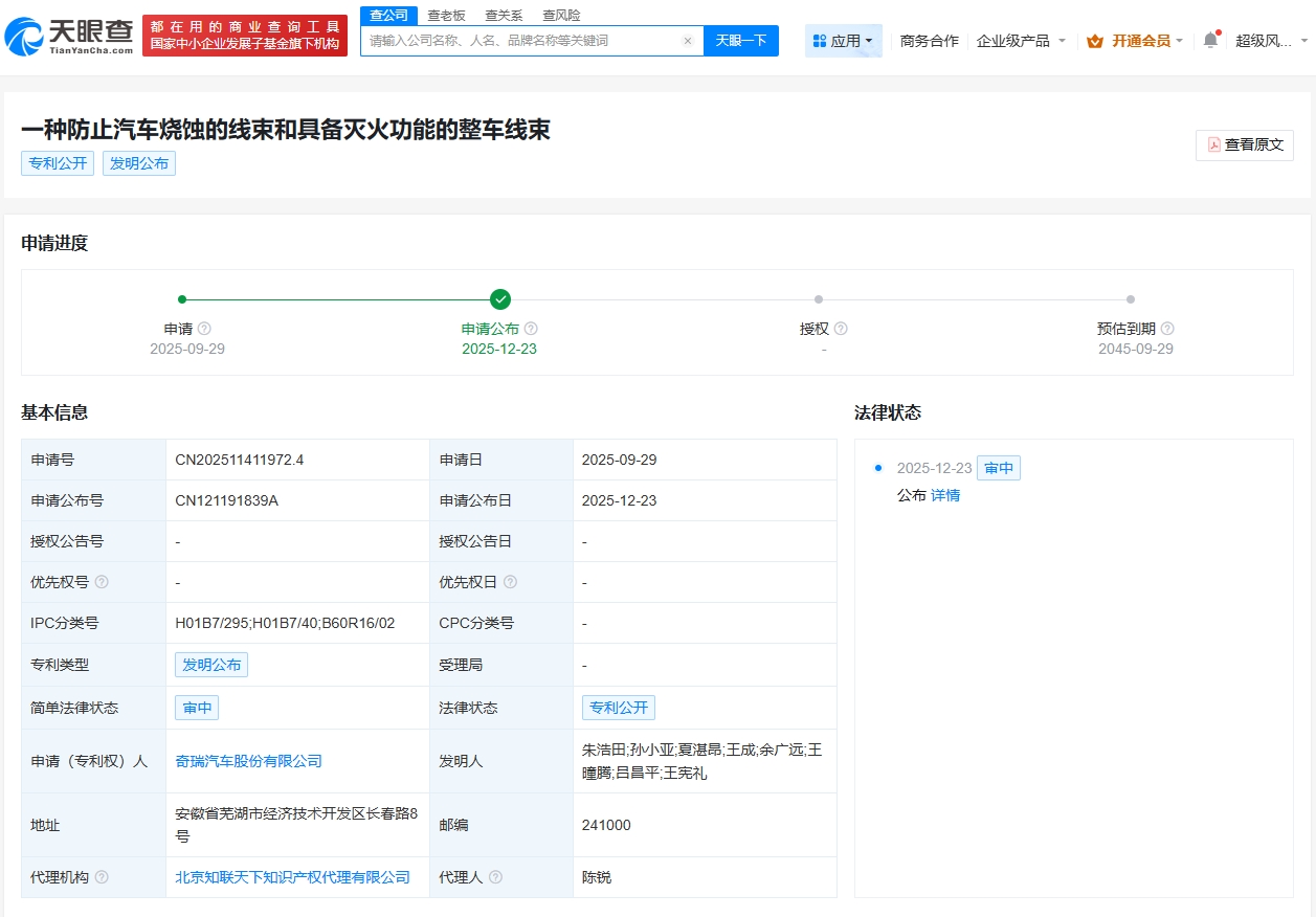 天眼查App显示,近日,奇瑞汽车股份有限公司申请的“一种防止汽车烧蚀的线束和具备灭火功能的整车线束”专利公布。