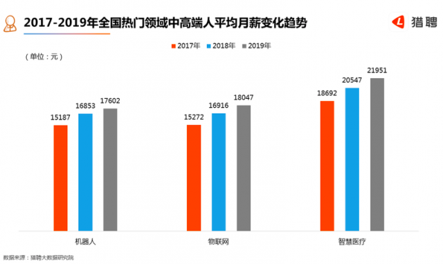 在全国中高端人才平均月薪排名最高的前20城市中,2019年一季度到三季度全国全行业应届生的平均起薪为7566元/月,智慧医疗、物联网、机器人中高端人才平均月薪为21951元、18047元、17602元。