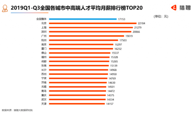 报告显示,在全国中高端人才平均月薪排名最高的前20城市中,北京、上海、深圳位居前三,平均月薪均过2万,分别为22184元、21279元、20866元。广州薪资排名第四,为19019元。杭州薪资排名第五,为17503元。北上广深杭的平均月薪均超过了全国中高端人才薪资的平均水平。