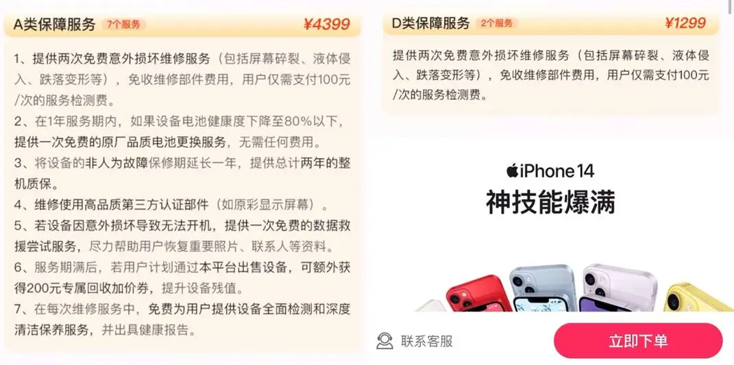 调查发现,根据售卖数码产品型号不同,享享购平台中售卖的数码产品分别被组合了A类、B类、C类、D类等四类不同的保障服务,平台标注四类服务包价值分别为4399元、2999元、1799元、1299元。