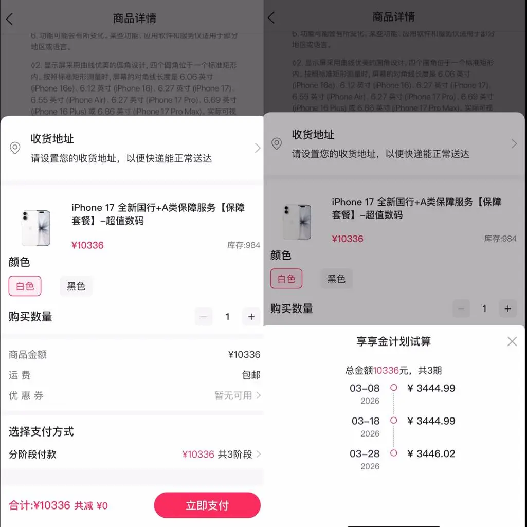 此外,在分期期限上,享享购也与常规分期商城不同:商品下单页面的享享金计划试算显示,订单总金额10336元,分3期还款,第一期为3月8日,还款3444.99元;第二期3月18日,还款3444.99元;第三期为3月28日,还款3446.02元,共计还款金额10336元。