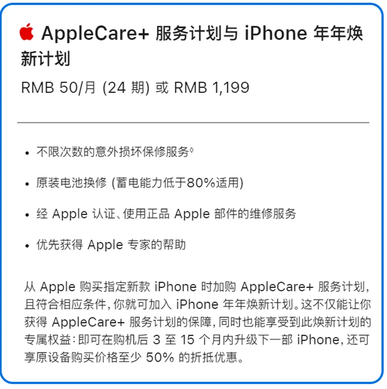 这类服务并未有公开市场价值可供参考。苹果官网显示,在选购苹果手机iPhone 17 (256GB)时,Apple Care+与年年焕新服务的售价为1199元。