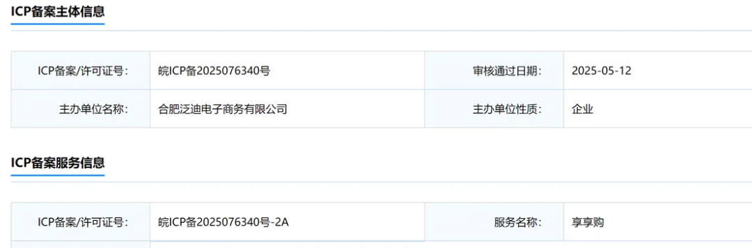 享享购的隐私协议显示,该App涉及到的企业名称为合肥泛迪电子商务有限公司(本文称“合肥泛迪”),该公司成立于2022年,其实控人为唐雪利。经ICP/IP地址/域名信息备案管理系统查询,享享购App审核通过日期为2025年5月12日。