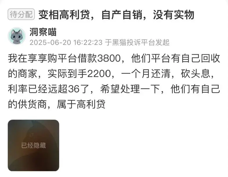 值得注意的是,黑猫投诉平台中,有多名消费者投诉在享享购平台购物却未收到货。还有一名消费者表示,在享享购平台借款3800元,实际到手2200元,并且需要在一个月内还清款项,该消费者在投诉中称该平台有自己的回收商家。