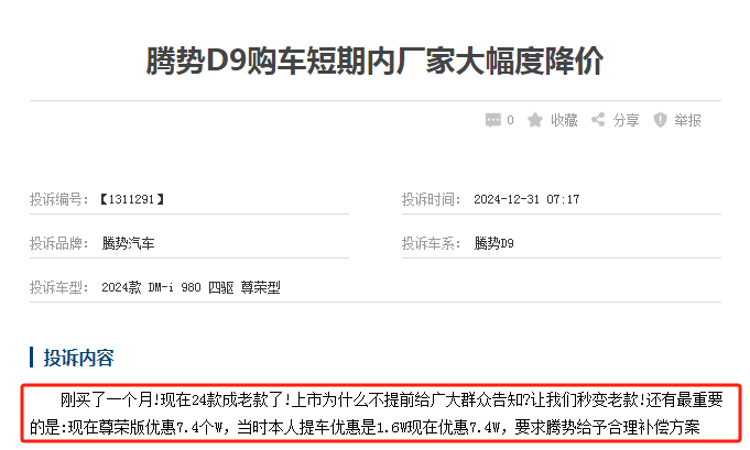 滕先生在2024年12月26日喜提了一辆2024款腾势D9,这本应是一件值得庆祝的事情。然而,提车后的第二天,滕先生却遭遇了当头一棒——他所购买的车型在原本已有3万元优惠的基础上,又突然降价2.4万元,总计优惠达到了5.4万元。这一突如其来的降价消息,让滕先生感到难以置信和愤怒。