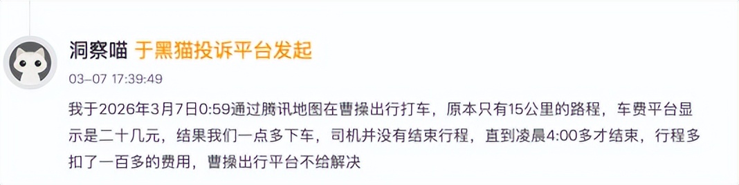 作为聚合打车平台,腾讯地图接入的第三方出行服务商的服务质量同样备受质疑。有消费者投诉称,于2026年3月7日0:59通过腾讯地图在曹操出行打车,原本只有15公里的路程,费平台显示是二十几元,结果一点多下车,司机并没有结束行程,直到凌晨4:00多才结束,多扣了一百多的费用。此外,在3月10日,消费者再次补充了投诉,表示平台处理不当,不给解决问题。