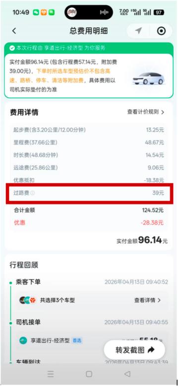 然而让邵女士始料未及的是,在支付了乘车费用后,其才发现,在明细中司机又添加了39元高速费用。