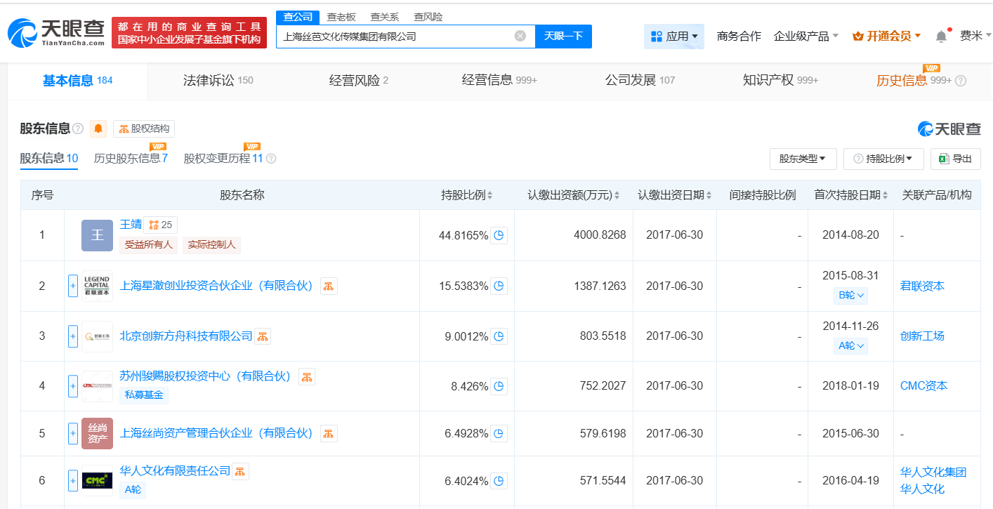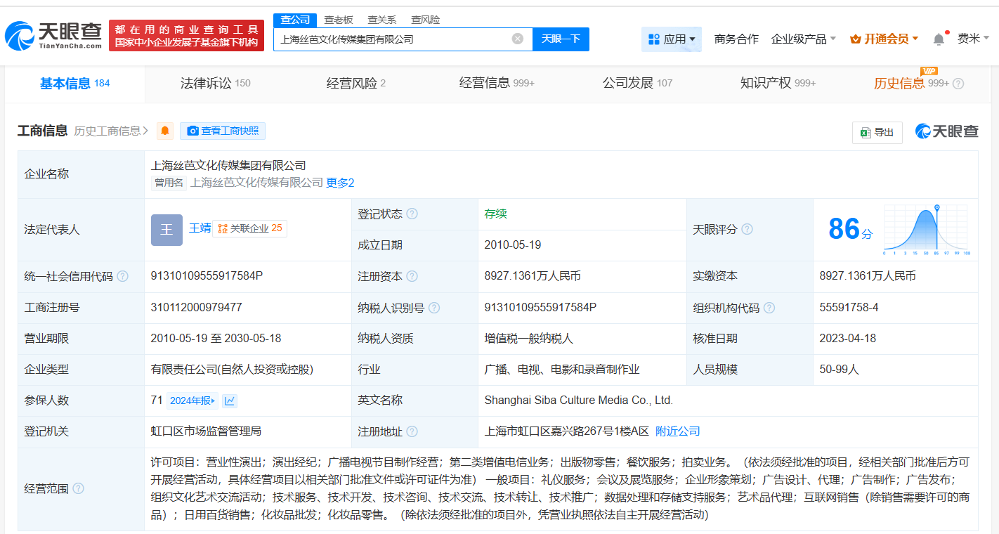 上海丝芭文化传媒集团有限公司成立于2010年5月,法定代表人为王靖,注册资本约8927万人民币,经营范围包括营业性演出、演出经纪、广播电视节目制作经营等,由王靖、上海星澈创业投资合伙企业(有限合伙)、北京创新方舟科技有限公司等共同持股。
