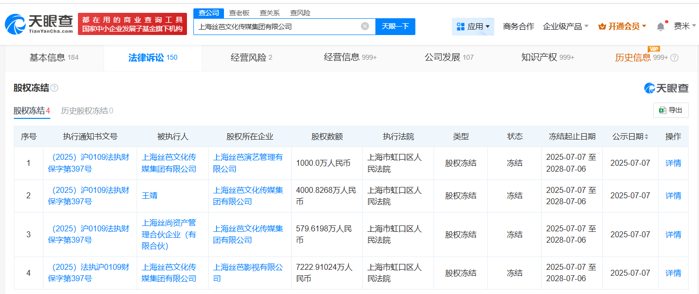 天眼查深度风险信息显示,近日,上海丝芭文化传媒集团有限公司新增4条股权冻结信息,冻结股权数额合计超1.2亿。被执行人包括该公司、丝芭传媒集团董事长王靖、上海丝尚资产管理合伙企业(有限合伙),股权所在企业包括上海丝芭演艺管理有限公司、上海丝芭文化传媒集团有限公司,冻结期限均为三年,执行法院均为上海市虹口区人民法院。