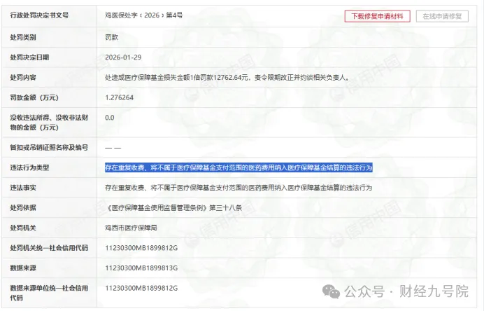 今年1月份,鸡西爱尔眼科医院有限公司也因为“存在重复收费、将不属于医疗保障基金支付范围的医药费用纳入医疗保障基金结算的违法行为”被查处,要求退回1.27万元医保资金,并处以一倍罚款,约谈了相关负责人。