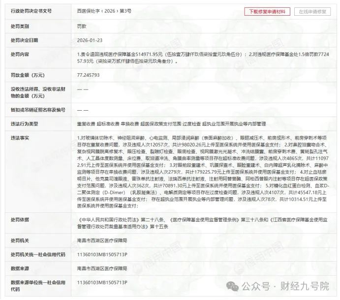 就在2026年1月23日,也就是前几天,爱尔眼科旗下的南昌爱尔眼科医院有限公司就因为医保违规被重罚了77万元!