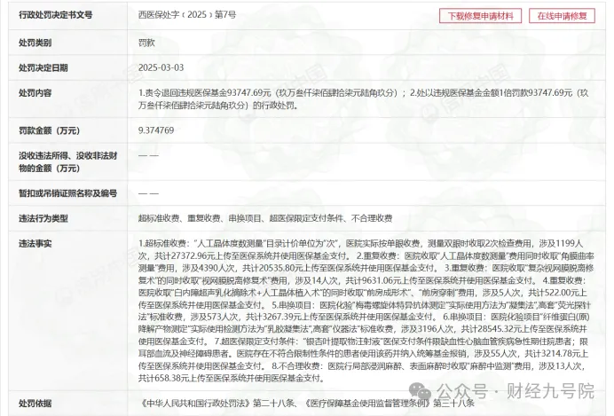 2025年3月,南昌市医保部门对该医院的查处发现,南昌爱尔眼科医院存在“超标准收费、重复收费、串换项目、超医保限定支付条件、不合理收费”等违规情形,违规套取医保资金9.37万元,在那次查处中,除了被责令退回的9万多医保资金,还被罚款了9.37万元。