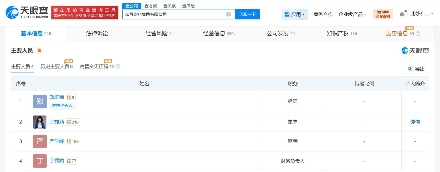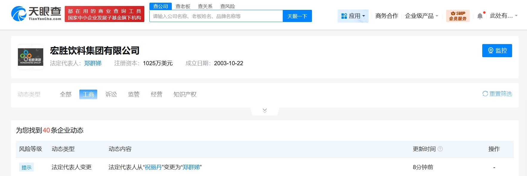 天眼查工商信息显示,近日,宏胜饮料集团有限公司发生工商变更,祝丽丹卸任法定代表人、经理,由郑群娣接任。