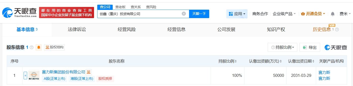 赛力斯成立创鑫投资公司 注册资本5亿观点