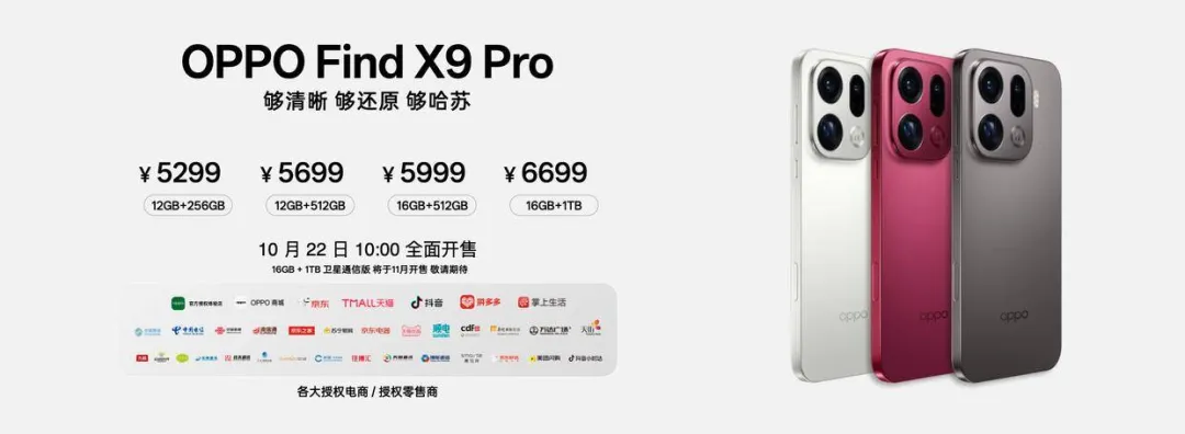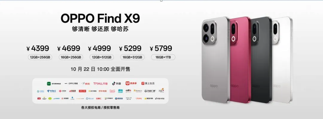 OPPO Find X9提供12GB+256GB、12GB+512GB、16GB+256GB、16GB+512GB、16GB+1TB共5个版本,售价分别为4399元、4999元、4699元、5299元、5799元。OPPO Find X9 Pro提供12GB+256GB、12GB+512GB、16GB+512GB、16GB+1TB共4个版本,售价分别为5299元、5699元、5999元、6699元。
