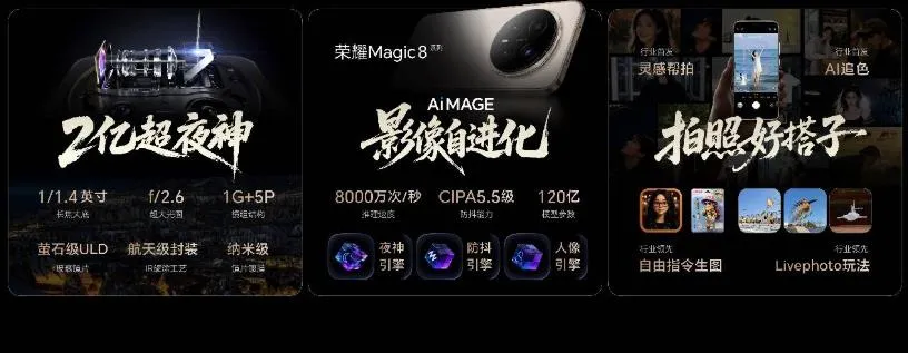 荣耀Magic8系列:搭载全新荣耀AiMAGE影像系统,应用了灵感帮拍、AI追色、AI修图、自由指令生图、全新Live图玩法等影像后期编辑与拍摄玩法,提升照片的动态范围和细节表现。同时,Pro版主摄搭载2亿超夜神长焦,高达120亿模型参数,带来肤质优化、光影还原、光斑拟真三大升级,这意味着你越拍,手机越懂你的审美,在夜景拍摄方面堪称“夜拍真神”。