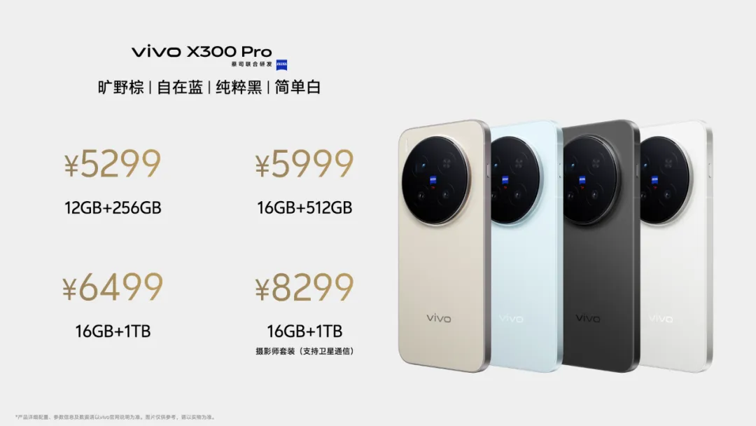 vivo X300提供12GB+256GB、12GB+512GB、16GB+256GB、16GB+512GB、16GB+1TB共5个版本,售价分别为4399元、4699元、4999元、5299元、5799元。 vivo X300 Pro提供12GB+256GB、16GB+512GB、16GB+1TB、16GB+1TB(卫星通信版)共4个版本,售价分别为5299元、5999元、6499元、8299元。